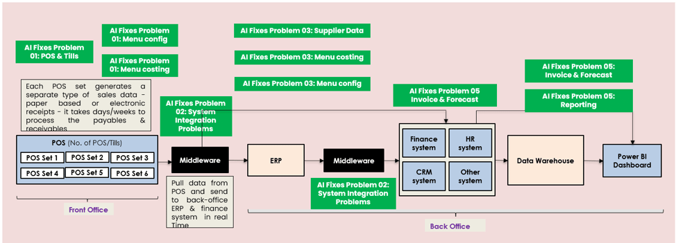 - AI automation then fixed all the broken areas – namely Supplier Data, Menu Costing, Menu & Tills config, POS & Tills, Invoice & Forecast – without changes in foundation system