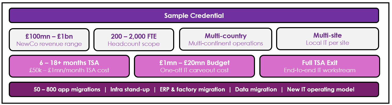 CIDEK has led multiple IT carveouts across sectors including Manufacturing, Tech, SaaS, IT Services, Healthcare, Industrial etc. A typcial NewCo has £100mn - £1,000mn revenue, 200 - 2,00 FTE, multi country and often multi-continent operations and IT set up and multi-site needing specific local IT needs. Some of these come with a nominal IT team transferred from ParentCo. More often, a new IT function and IT set up is set up from scratch for the NewCo. IT TSA costs range from £50k - £1mn per month, and IT one-off costs range from £1mn to £20mn, depending on the complexity and scale of the business. CIDEK has led migration of 50 - 800 apps of various complexities, with TSA duration of 6 months to 18 months or even longer.