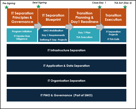 IT Separation Blueprint [Sign (Day 0) to Close (Day 1)]: Day 1 readiness is focused on supporting the seller on logical segregation of NewCo App, Data & Infra, with appropriate cyber security set up. Transition planning on any activity which buyer will need to support to manage NewCo IT is planned and executed with precision.